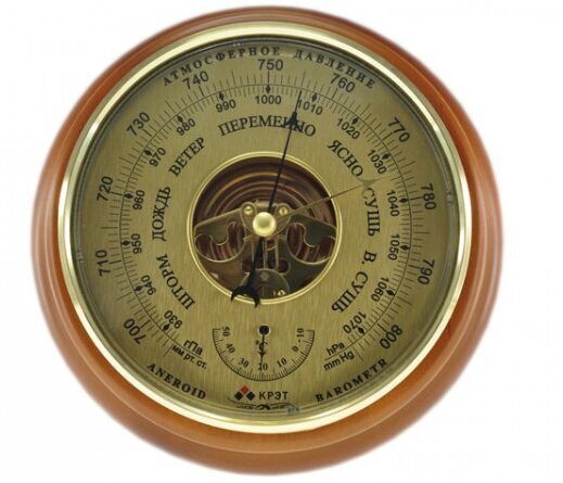 Барометр Утес БТК-СН 8 (второе название Анероид) с интегрированным термодатчиком для получения данных о состоянии атмосферного давления и температурного режима в локациях, находящихся в географических районах с альтитудой не выше 200 метров над уровнем моря. Данный барометр приобретают люди, у которых наблюдается повышенная метеочувствительность, с его помощью можно предопределить метеорологические изменения в атмосфере, от которых зависит самочувствие и работоспособность человека, и заранее подготовить себя к этим колебаниям.Барометр (Анероид) Утес БТК-СН 8 – это прибор со стрелочным механизмом, принцип работы которого заключается в воздействии на него, а точнее на анероидный чувствительный элемент барометра, атмосферного давления. Баротермометр Утес БТК-СН 8 имеет уникальную конструкцию, во-первых, данное устройство оснащено циферблатом с тремя шкалами, одна из которых отображает данные об атмосферном давлении, измеряемые по стандарту в миллиметрах ртутного столба (в диапазоне 695-805 мм. рт. Сб), вторая те же данные, но только в гектопаскалях (с диапазоном 927-1073 гПа), а третья шкала показывает температуру воздуха. Таким образом, барометр Утес БТК-СН 8 получил второе название – баротермометр. Большим преимуществом данного измерительного прибора Утес БТК-СН 8 является то, что он имеет большой удобный циферблат, прочитать данные с него без проблем смогут люди даже с плохим зрением. К дополнительным преимуществам, которыми может похвастаться барометр Утес БТК-СН 8, относятся следующие особенности: Барометр производится в Ульяновске на производственных мощностях ОАО «Утес», основное направление данного производителя – создание специальных измерительных гаджетов для авиационной сферы и космонавтики. Баротермометр Утес БТК-СН 8, так же, как и его аналоги, полностью отвечают предписаниям и стандартам образца ТУ1-099-20-85. Гарантия на данный барометр от изготовителя составляет полтора года с момента продажи. Средний срок службы прибора составляет 10 лет. Как было подмечено выше, баротермометр имеет уникальную конструкцию, главным компонентом которой является сверхчувствительный механизм барометра. Что интересно, изготавливается этот механизм барометра исключительно по технологии немецкой компании «Эйнсоф». Также немаловажен тот факт, что баротермометр изготовлен исключительно из высококлассных материалов, корпус – из натурального дерева, а сам механизм – из нержавеющих и не подвергающихся влиянию от электромагнитных колебаний металлов. Таким образом, вы можете не беспокоиться за эксплуатацию прибора в условиях повышенной влажности. Технические характеристики: Диапазон измерений давлений от 695 до 805 мм.рт.ст. (927-1073 гПа). Диапазон измерений температуры от -10 до +50°С. Габаритные размеры: 210 мм (наибольший Ø) Х 55 мм (толщина). Диаметр циферблата 160 мм. Вес 0,95 кг. Комплектация: Баротермометр БТК-СН 8 - 1 штука. Руководство по эксплуатации - 1 штука. Подарочная упаковочная коробка - 1 штука.
