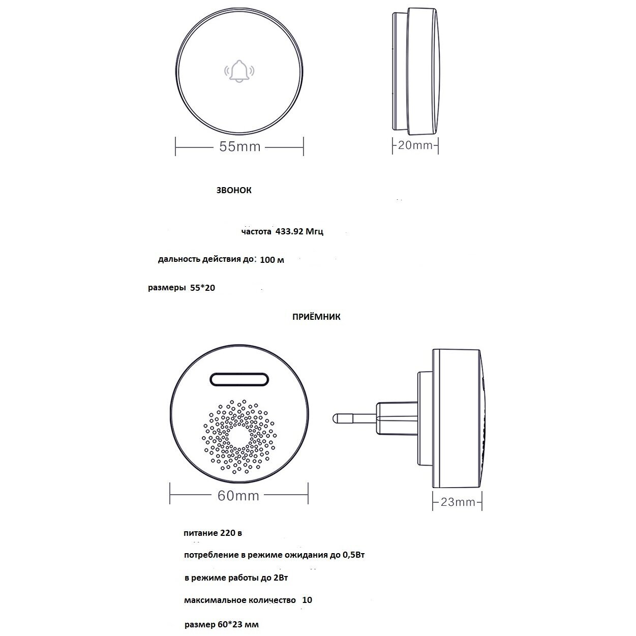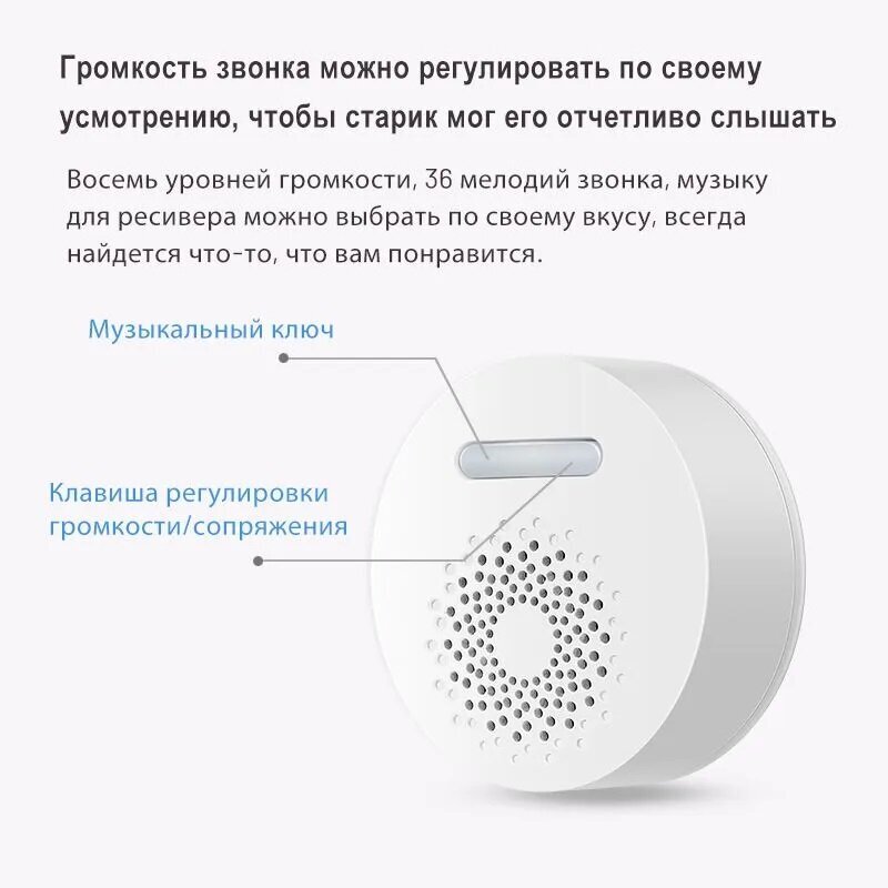 3 Привязка кнопки: нажать и удержать кнопку громкости 5 секунд. В это время нажать на кнопку звонка. При привязке будет звучать мелодия и световая индикация. Максимально можно привязать до 10 звонков