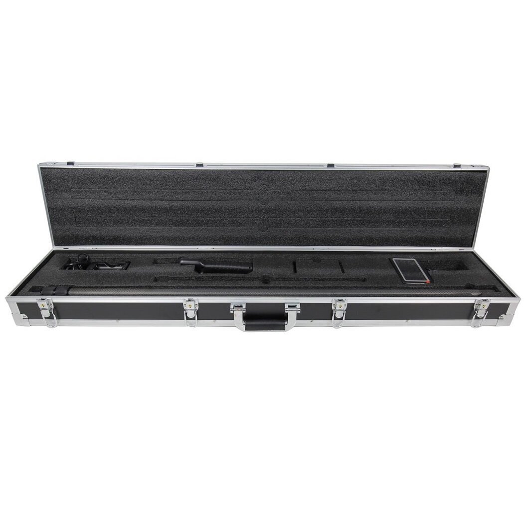 Технические характеристики камеры включают размер камеры ø23мм*510мм, разрешение видео 720*576, угол обзора 105°, подходящий диаметр трубы 30-200мм, формат видео AVI, 8-уровневый цифровой зум, размер экрана 4,3-дюймовый цветной TFT-экран, общее количество пикселей 480*27, отображение уровня заряда батареи, кнопки управления видеорегистратором, регулируемая яркость светодиодов, время зарядки 4 часа, время работы ≥200 минут, материал стойки углеродное волокно, соединения телескопической стойки 3 соединения, длина (мин./макс.) 1080 мм/2850 мм, общая длина 3600 мм, размер кейса 1145 (Д) * 250 (Ш) * 125 (В) мм.