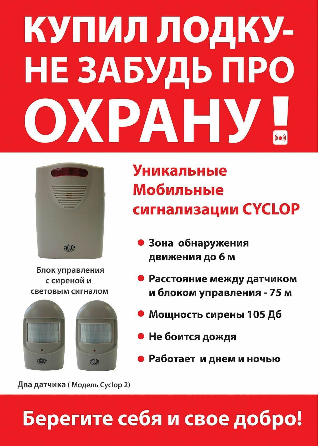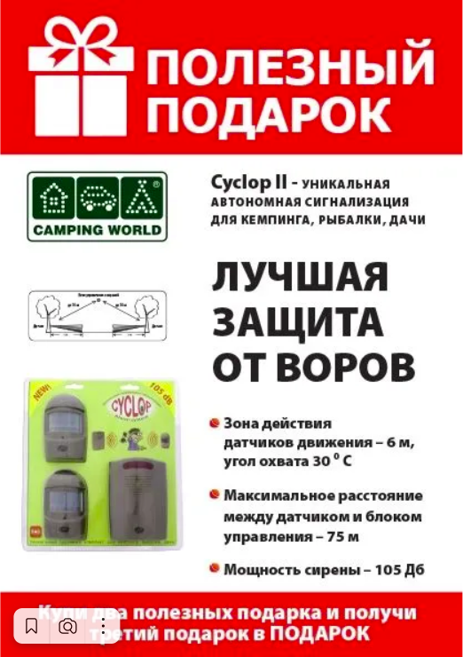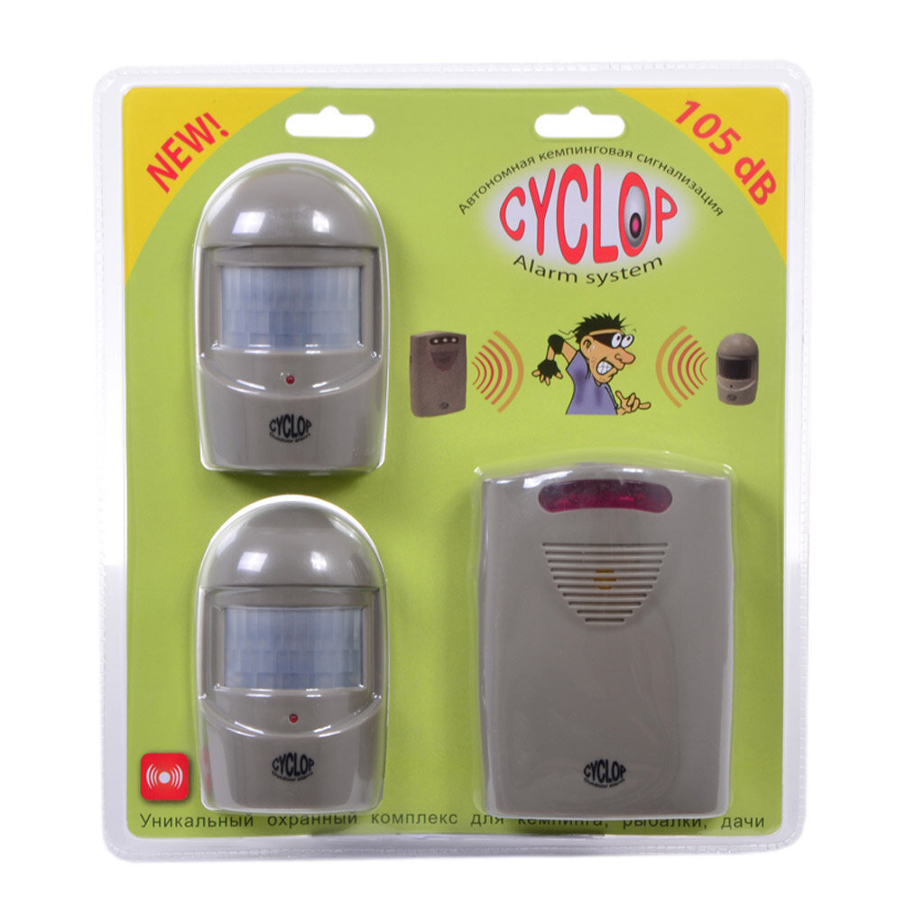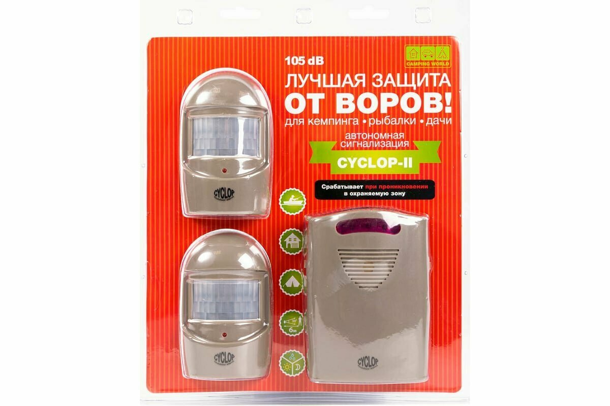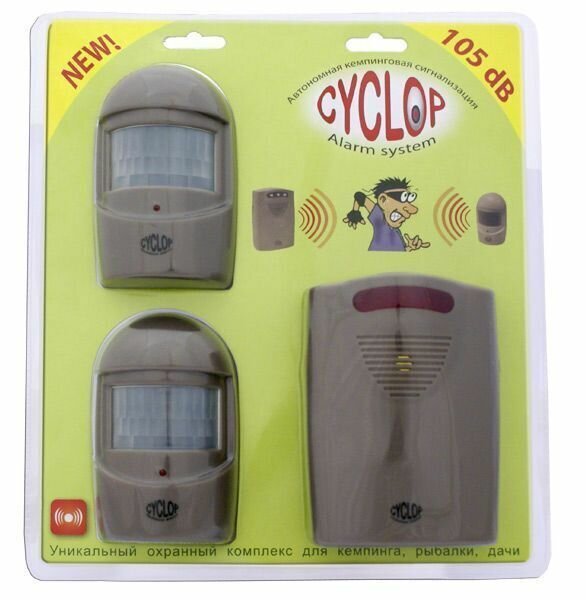 Уникальная автономная (на батарейках) охранная система «Cyclop-2» («Одноглазый-2») фокусируется на охраняемой области, которую вы выбрали. Устройство с двумя датчикамм движения может держать под контролем, т.е. охранять территорию порядка 40 квадратных метров!!! Вам достаточно, определив охраняемую область, установить датчики движения так, чтобы все охраняемые объекты были в зоне их действия и включить базовый блок. Датчики движения не боятся дождя.