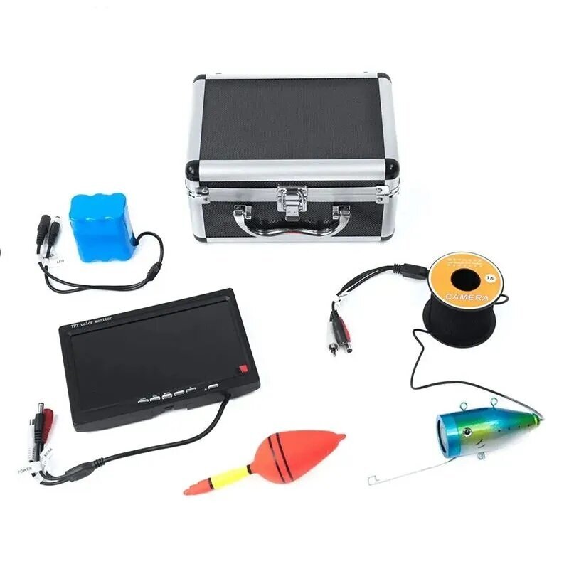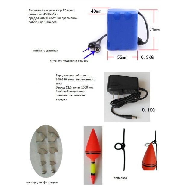Видеокамера комплектуется кабелем повышенной прочности, который обеспечивает надежное соединение с удочкой. Питание осуществляется от мощного аккумулятора, который обеспечивает до 6 часов автономной работы.